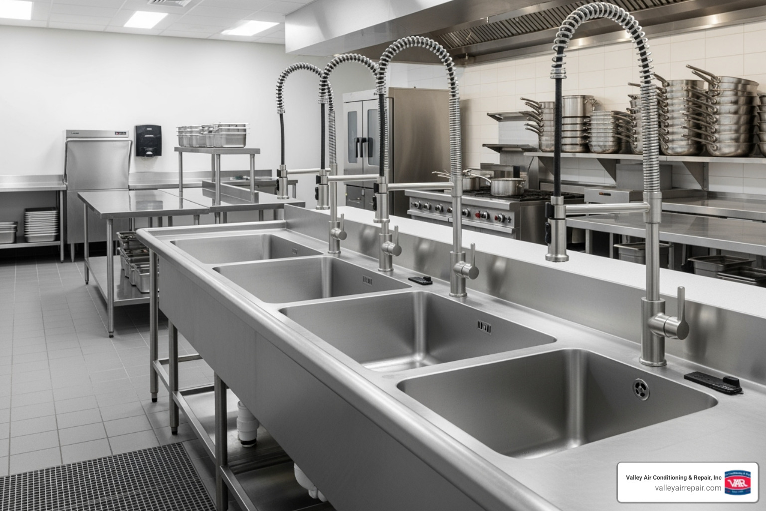 The primary difference is scale and demand. Commercial plumbing uses industrial-grade pipes and fixtures built for high-volume use, unlike residential systems. Commercial fixtures must handle hundreds of daily uses, greater water pressure, and larger waste volumes across multiple floors. They are also subject to stricter building and health codes, especially in environments like restaurant kitchens which require grease traps and heavy-duty drainage. This is why commercial plumbing fixture repair requires specialized expertise, tools, and materials.